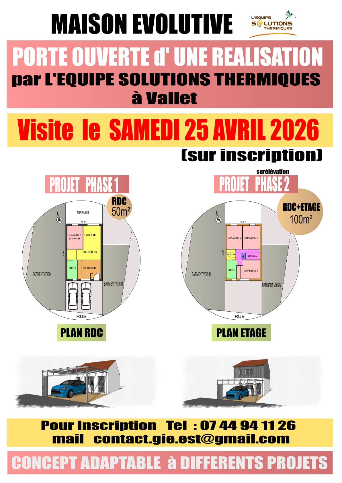 Le samedi 25 avril 2026, le GIE L’Équipe Solutions Thermiques organise une porte ouverte à Vallet, sur inscription. Cet événement permettra de découvrir une réalisation autour du concept de maison évolutive.